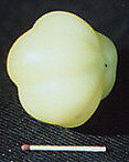 Apfelförmiger Paprika mit (für Kalvilläpfel) typischen Ausbuchtungen, Farbe weißer Klaräpfel, später schön rot. Seit 2000 vom AN-Sortenarchiv.