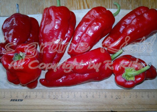 Blockförmige, mitteldickwandige Früchte (12x7cm), erst grün, dann intensiv rot, saftig. Reichtragender milder Freilandpaprika. Seit 2001 vom AN-Sortenarchiv.