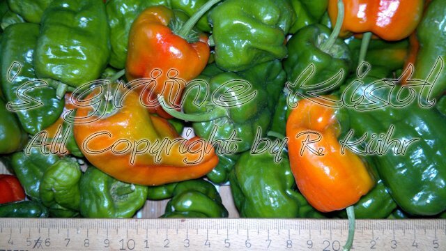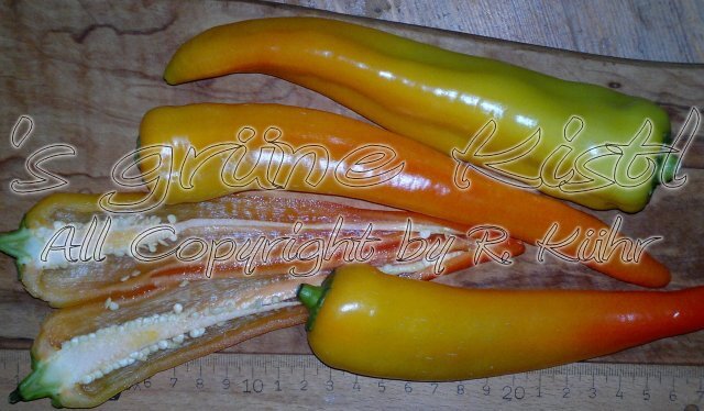 50cm hohe, buschig verzweigte Pflanzen, stark behangen mit hellgelb über orange nach rot abreifenden, länglichen Früchten (8-12cm Länge und 4-5cm Schulterbreite). Frischfruchtiger Geschmack. Schärfe 5. Von A. Moser.