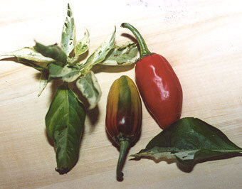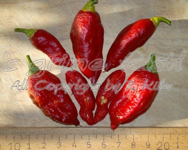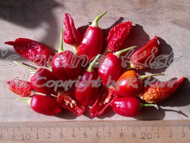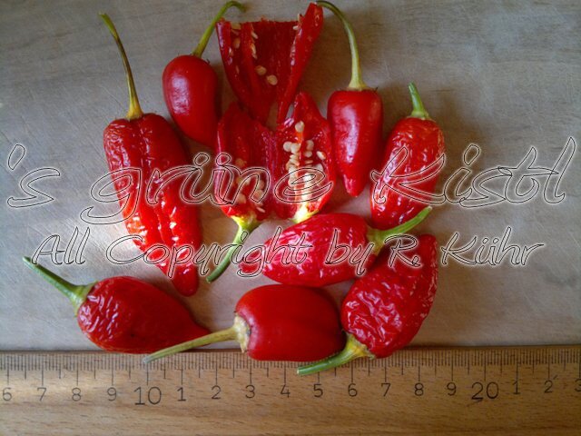 Capsicum baccatum. Pflanze bis zu 1m hoch mit spät reifenden, roten, scharfen, aber fruchtig-süßen Früchten, meist 10cm lang. Seit ca. 2000 vom AN-Sortenarchiv