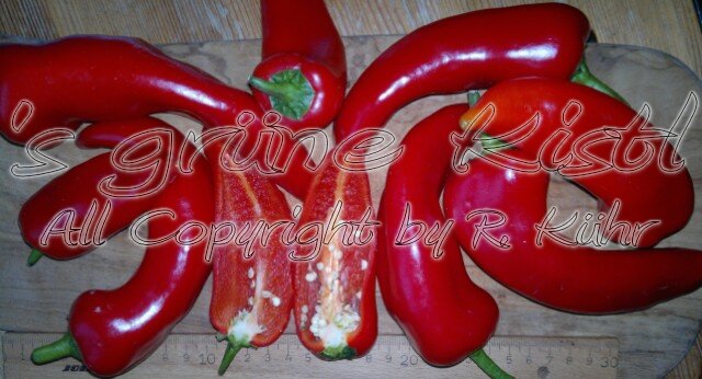 Spitzpaprika, bis 15cm lang, ø -5cm, reift dunkelrot und schmeckt dann süß. Pflanze braucht viel Wärme und wird bis 50cm hoch. 2000 in Form einer Patenschaft vom AN-Sortenarchiv, von der Kroatiensammelreise.