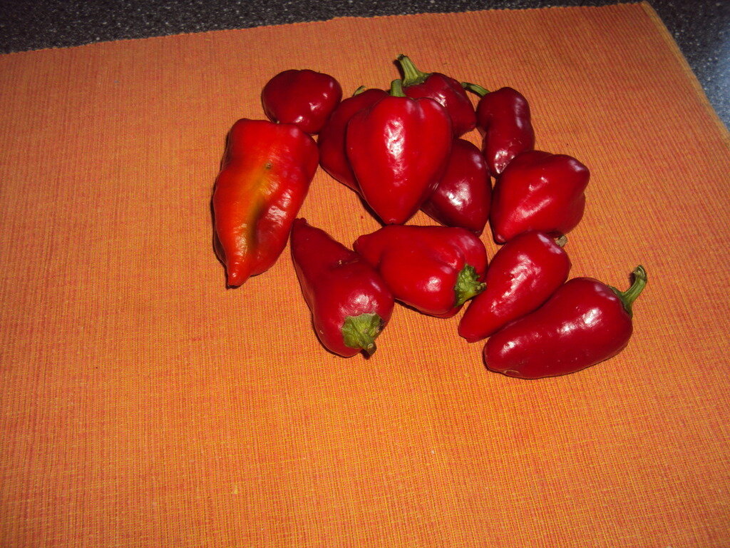 Capsicum annuum. Roter Gemüsepaprika, nur klein bis mittelgroß (max. 10cm lang), dunkelrot, süß-aromatisch und früh reifend (Mitte Juli). Pflanzen ca. 60cm hoch. Seit 2016 von AN-Sortenarchiv.