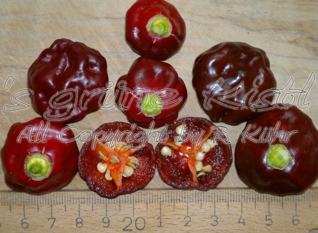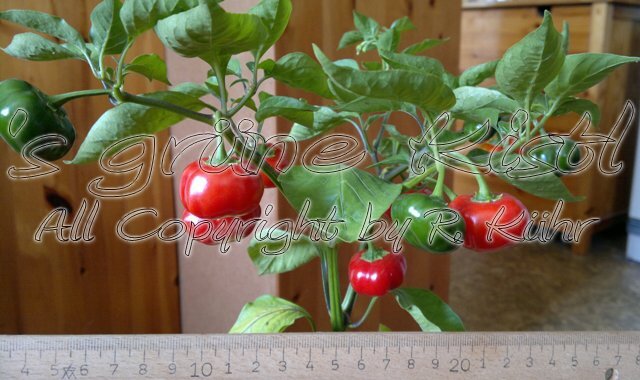 Rote Früchte aufrecht wie bei Zierpaprika, Schärfe 8, Pflanze erreicht eine Höhe von etwa 60 cm, sehr guter Ertrag. Auch als Topfplanze geeignet. Gut zum Lufttrocknen. Vom AN 2010