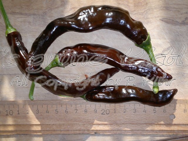 Ca. 30cm hoch (Topfkultur); aufrecht, buschig; weiße Blüte; hängende 1 cm breite, ca. 10 cm lange, gekrümmte und gebogene Früchte; reift von grün auf schokobraun ab, Schärfe 0-4 (0: mild, 10: sehr scharf); hoher Ertrag, dünnwandig; hervorragend zum Trocknen geeignet; gut für Mole geeignet; robust und gesund; Seit 2013 von Gärtnerei, Ö;