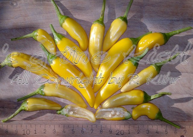 Ca. 70 cm hoch, ca. 40 cm (Topfkultur); aufrecht, buschig; grünes Blatt; weiße Blüte; stehende, längliche, ca. 1,5 x 4-6 cm große Früchte, unreif: grün, reif: intensives gelb; Schärfe: 7, sehr hoher Ertrag, sehr robust. Seit 2010 von einem Bekannten.