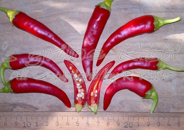 ca. 70cm hoch; straff aufrecht; weiße Blüte; aufrecht stehende, 3-4 cm lange, 8 mm breite Früchte; reift von grün auf rot ab, 15-20 Stück in Büscheln pro Stiel. fein säuerlicher Geschmack, Schärfe 7 (0: mild, 10: sehr scharf); hoher Ertrag, hervorragend zum Trocknen wegen Dünnwandigkeit und buschiger Fruchtanordnung; Saatgut, Seit 2005 von Gärtnerei, Ö;