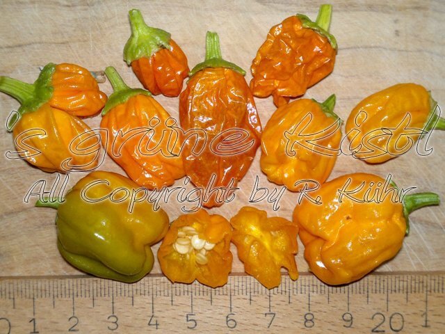 ca. 80 cm hoch; aufrecht, buschig, breit ausladend; grünes, stark strukturiertes Blatt, cremefarbene Blüte; hängende, blockige, teils gefurcht, ca. 3 x 5 cm große Früchte, reift von grün auf gelb-orange, Schärfe: 10+ (0:mild, 10:sehr scharf), hat kaum das typische "Habanero-Eigenaroma"; Saatgut ab Herbst 2013; seit 2006 von Gartenbaumesse Tulln;