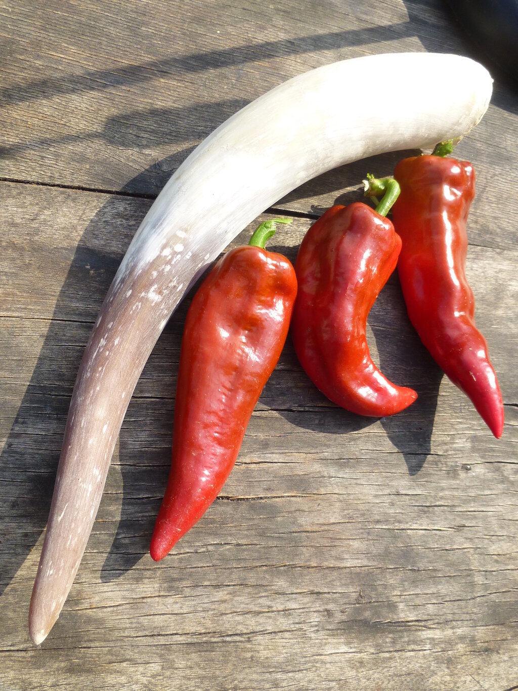 Gemüsepaprika bis ca. 1,10m. Frucht weiß, rot abreifend, ca. 17cm lang. Prima für Frischverzehr. Seit 2004 von M. Hahm. Kleine Mengen nur für Mitglieder.