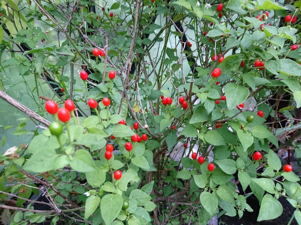Mehrjähriger Baumchili, 2 m hoch. Blüte lila. Früchte rot, Durchmesser 5 cm, mittelscharf. Ernte VIII - I. Seit 2012 aus einer Gärtnerei in Vorarlberg/Ö. Nur kleine Mengen vorrätig.