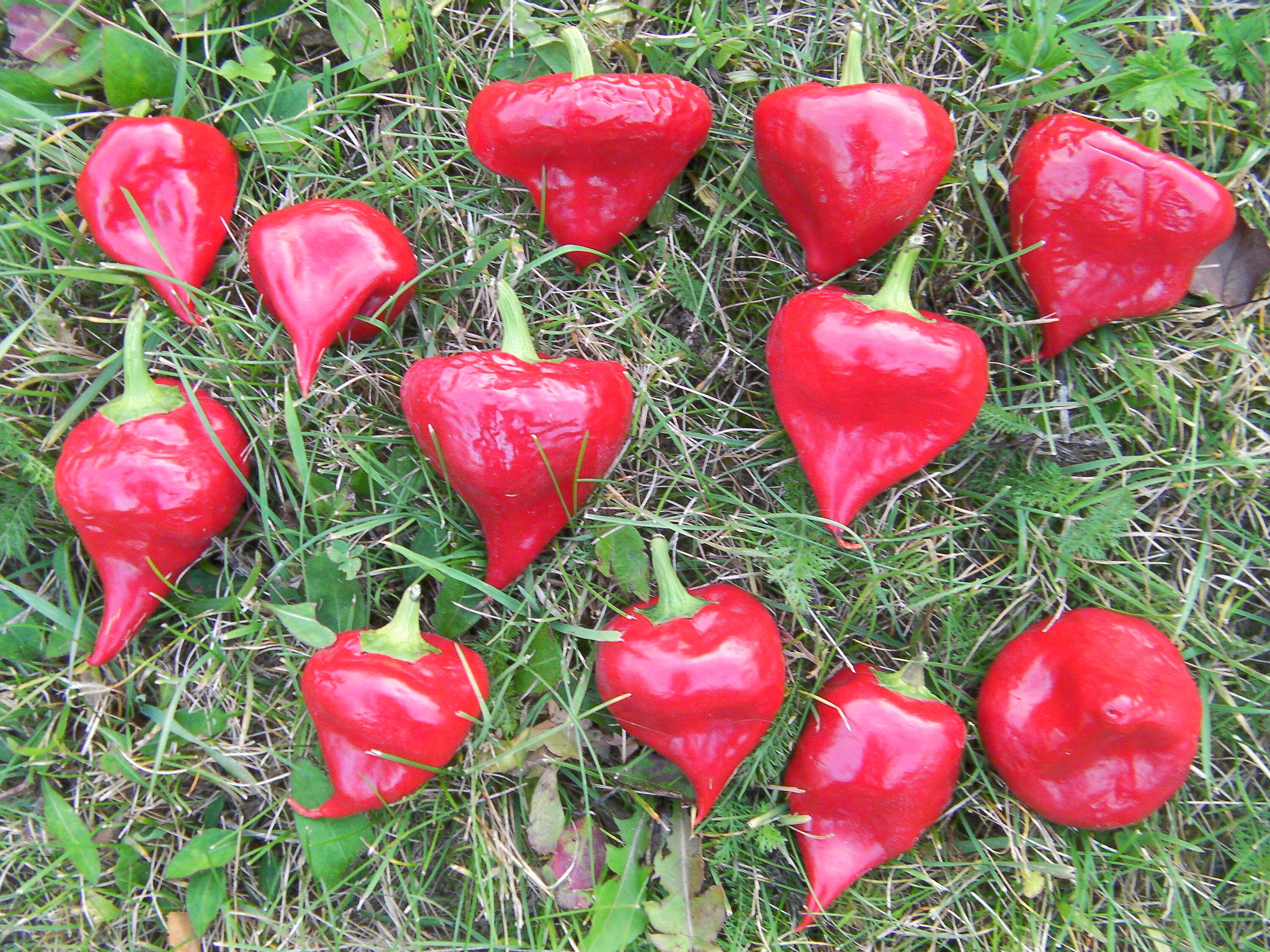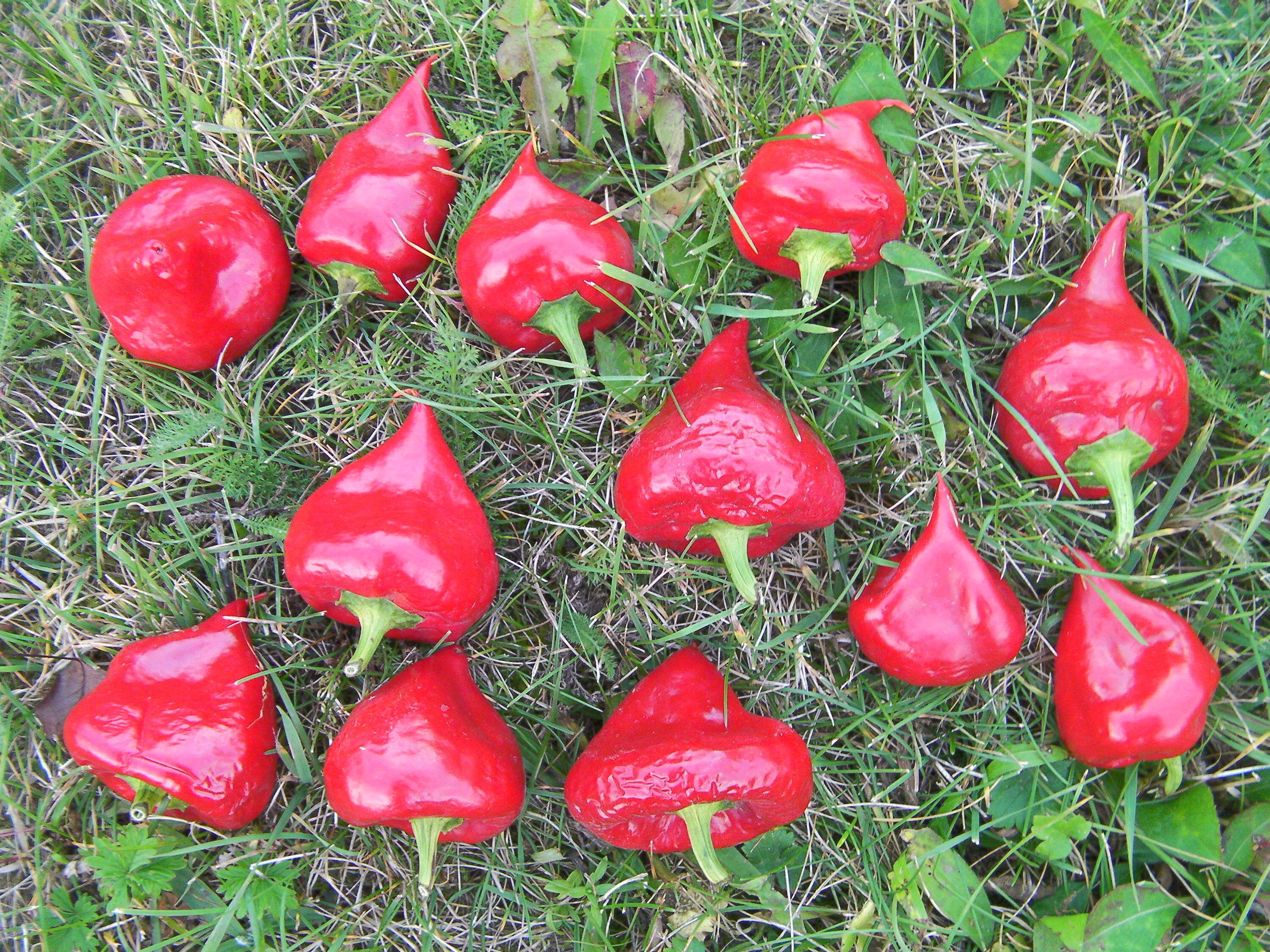 1,2m hoch. Früchte wie kleine Kürbisse von dunkelgrün auf rot abreifend. Schärfe 4. Seit 2007 von Mo Peppers.
