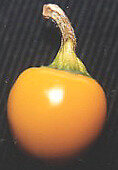 ca. 40 - 60 cm hoch; aufrecht, buschig; grünes Blatt; sehr große, weiße Blüte; stehende, rund - leicht zugespitzte, intensiv gelbe Früchte, süßlich, unreif: grün, reift auf gelb ab; Schärfe: 5-6, (mild, 10 sehr scharf); hoher Ertrag; robust, gut für ganzjährige Zimmerkultur geeignet; Saatgut; 2004, Gärtnerei, Ö;