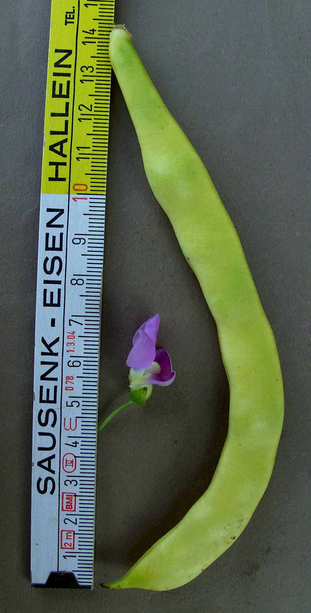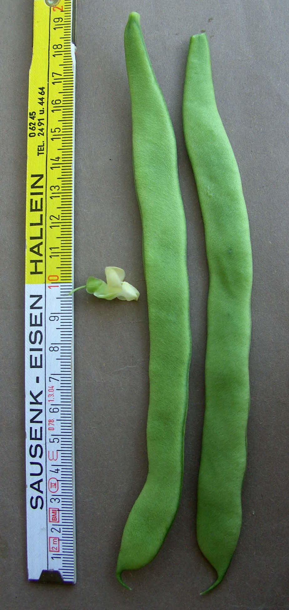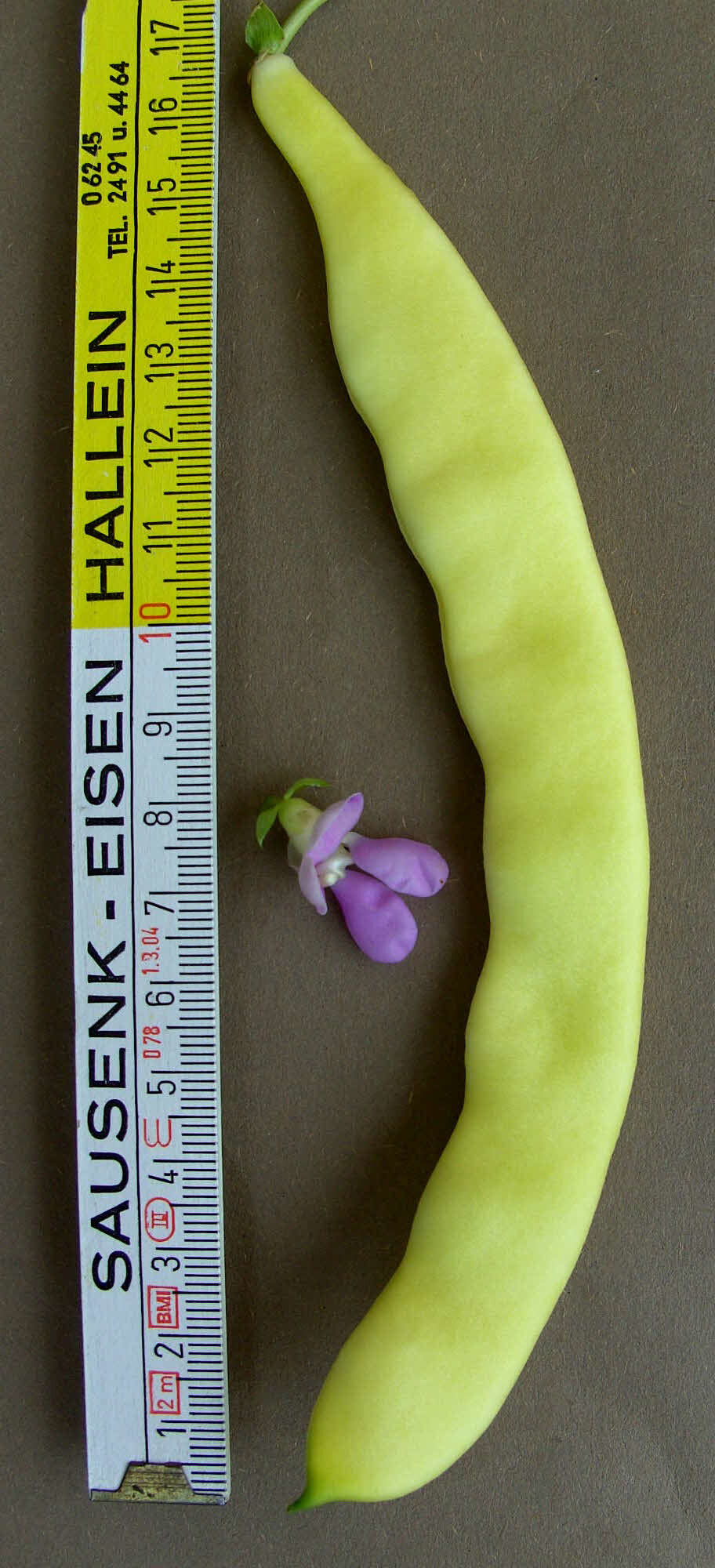 Klettert 3m hoch, hat 20 cm lange, fleischige, grüne Hülsen, weißes, längliches Korn. Kann lange als Fisole genutzt werden. Sehr vielseitig verwendbar.