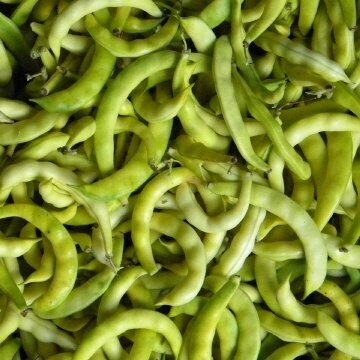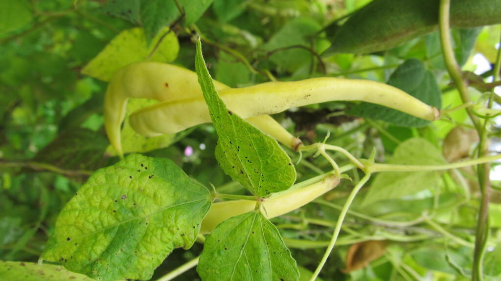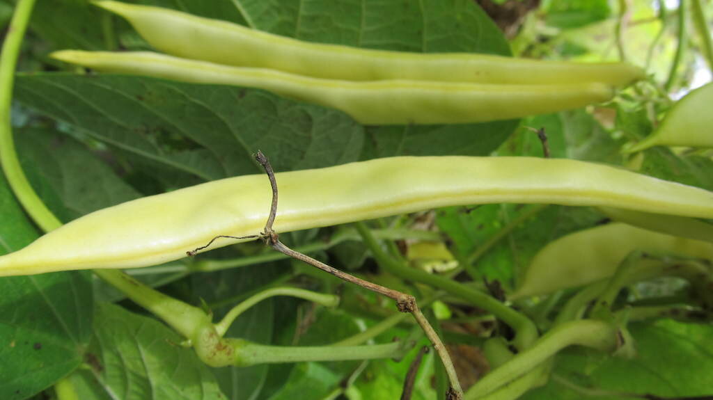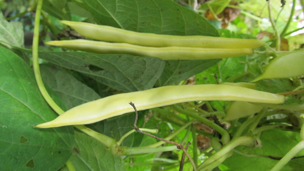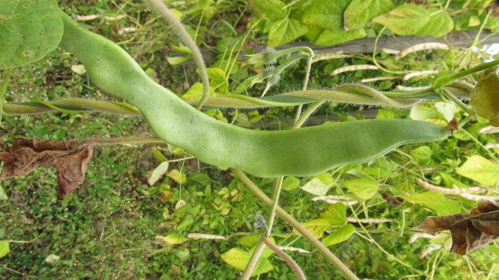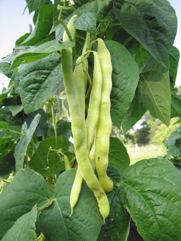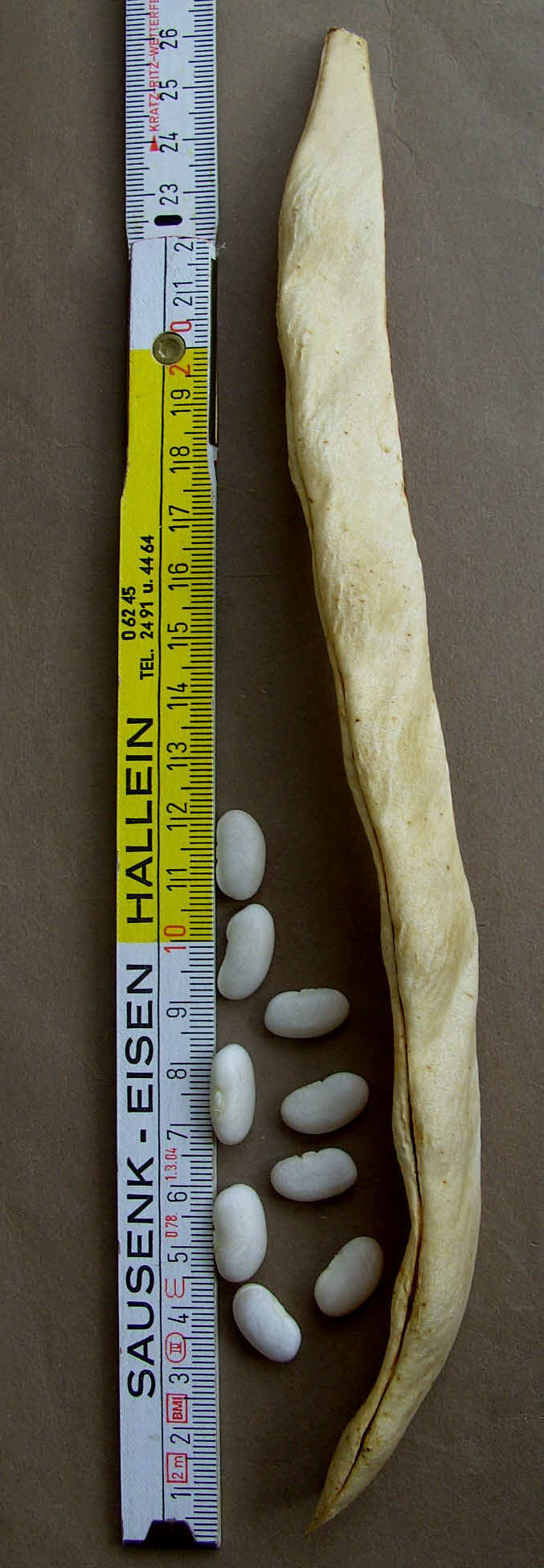 Klettert 3m hoch, hat 20 cm lange, fleischige, grüne Hülsen, weißes, längliches Korn. Kann lange als Fisole genutzt werden. Sehr vielseitig verwendbar.