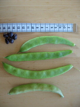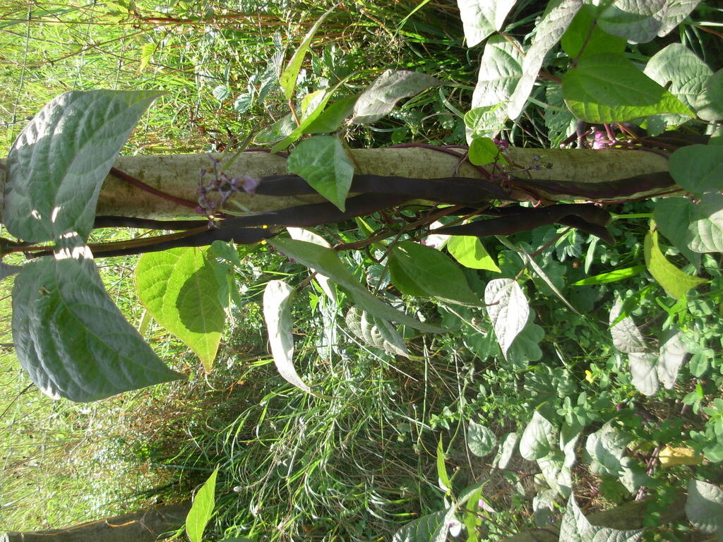 2,2 m hoch. Hülsen lila und grün, 18 - 24 cm lang, wuchtig, Korn schwarz mit weißem Nabel, 8 - 10 pro Hülse. Als Brechbohne genutzt, Hülsen auch zart beim Kochen, wenn Samen schon ausgebildet sind. Sehr ertragreich auch auf schlechten Böden. Seit ca. 2000 von einem Freund aus Deutschland.