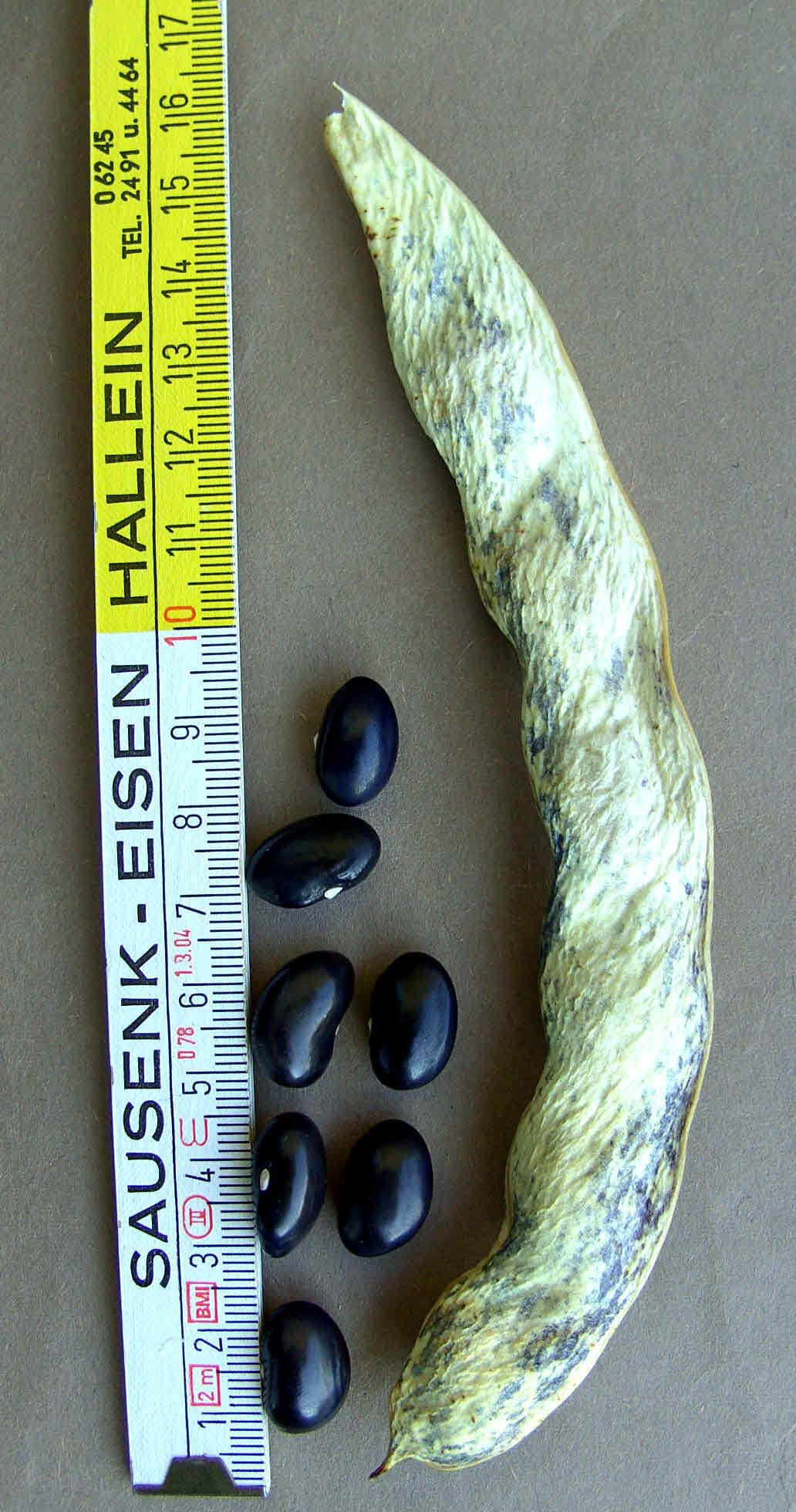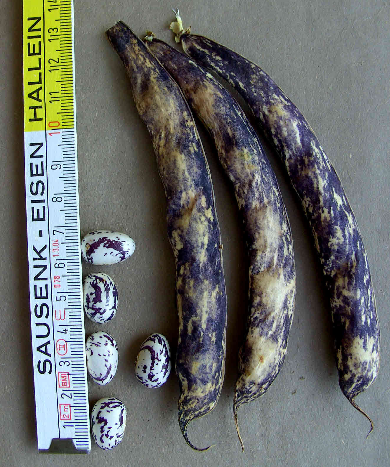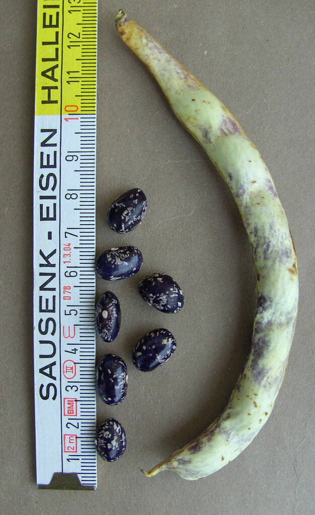Klettert 2m hoch, Hülsen sind rot geflammt und kipflerförmig, nicht sechserförmig gebogen, Korn beige mit schwarzen Längsstreifen. Trockenbohne.