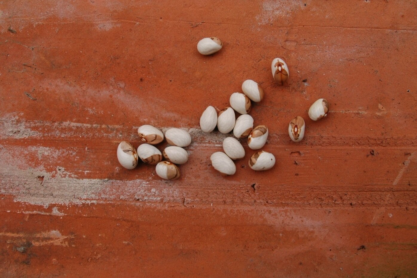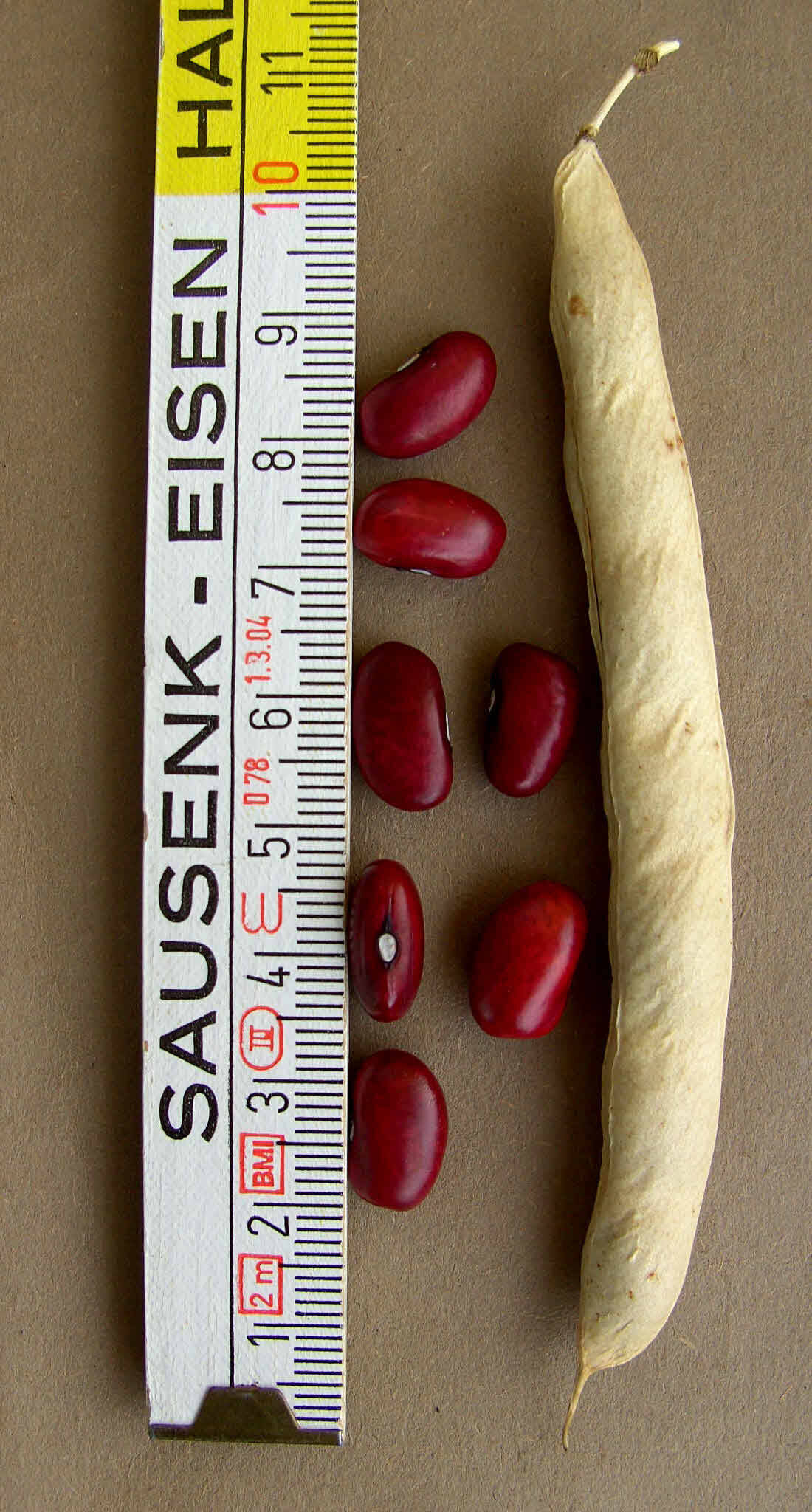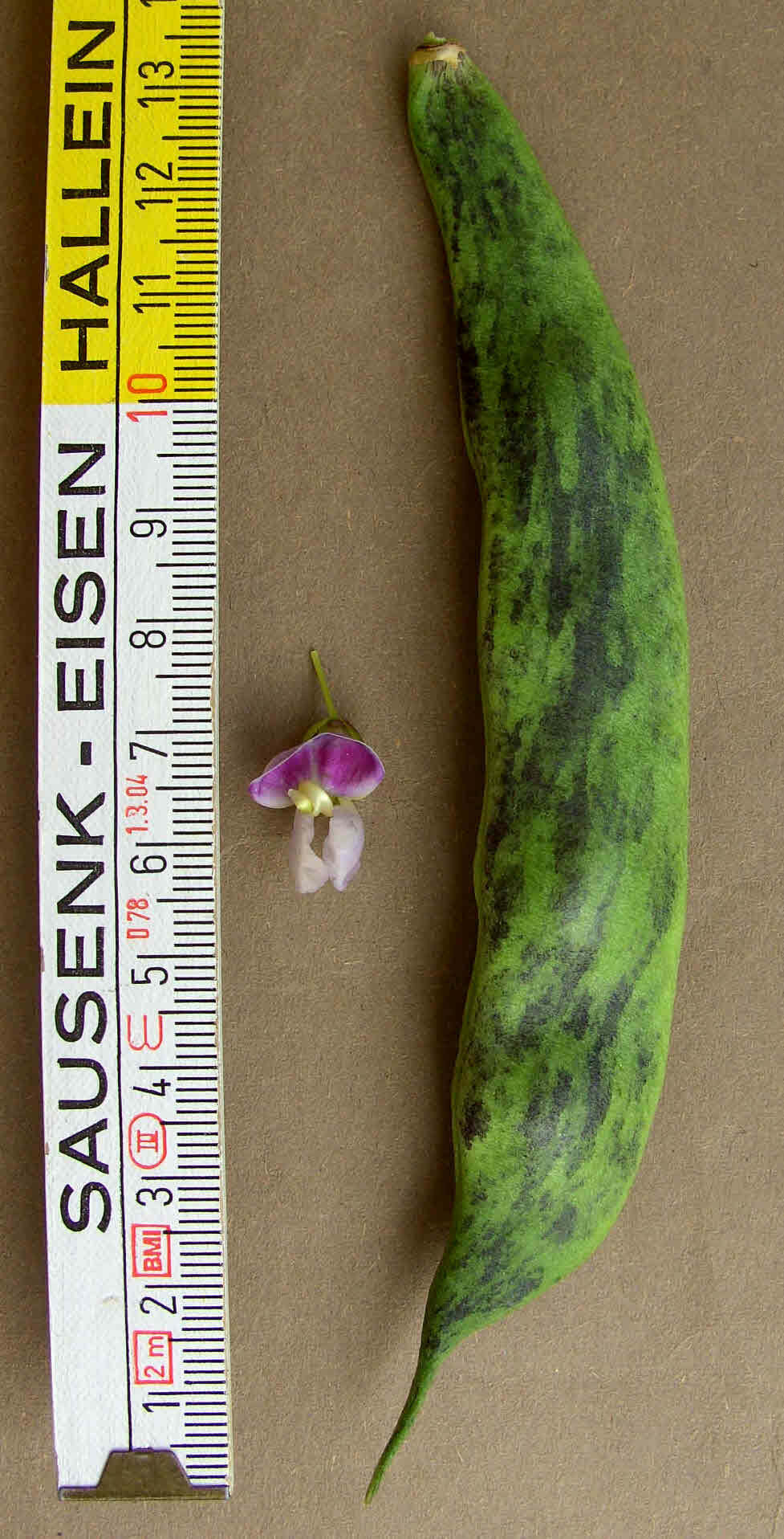 Klettert 2m hoch, Hülsen sind rot geflammt und kipflerförmig, nicht sechserförmig gebogen, Korn beige mit schwarzen Längsstreifen. Trockenbohne.