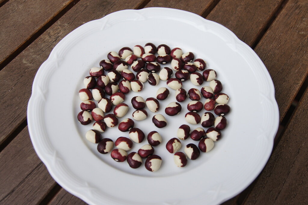 Hoch rankend, Fisole grün, eher flach, nicht gebogen. Korn weiß-dunkel-weinrot-Yin&Yang Zeichnung mit manchmal einem weinroten Punkt auf der weißen Hälfte. Korn rundlich- oval, groß. Guter Ertrag. Schön und lecker.