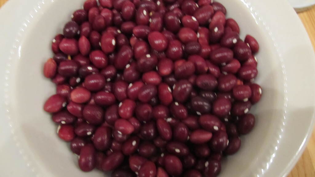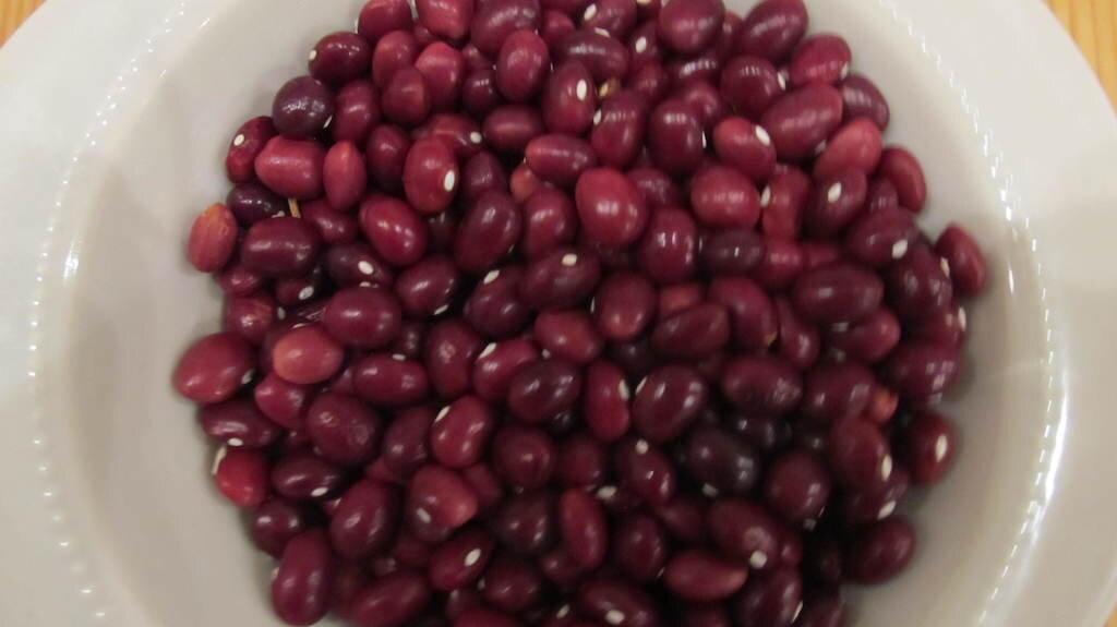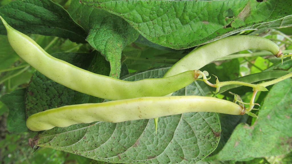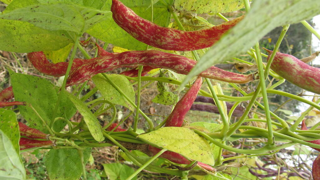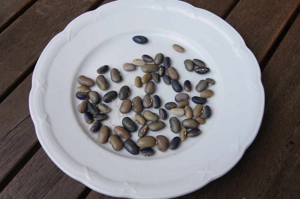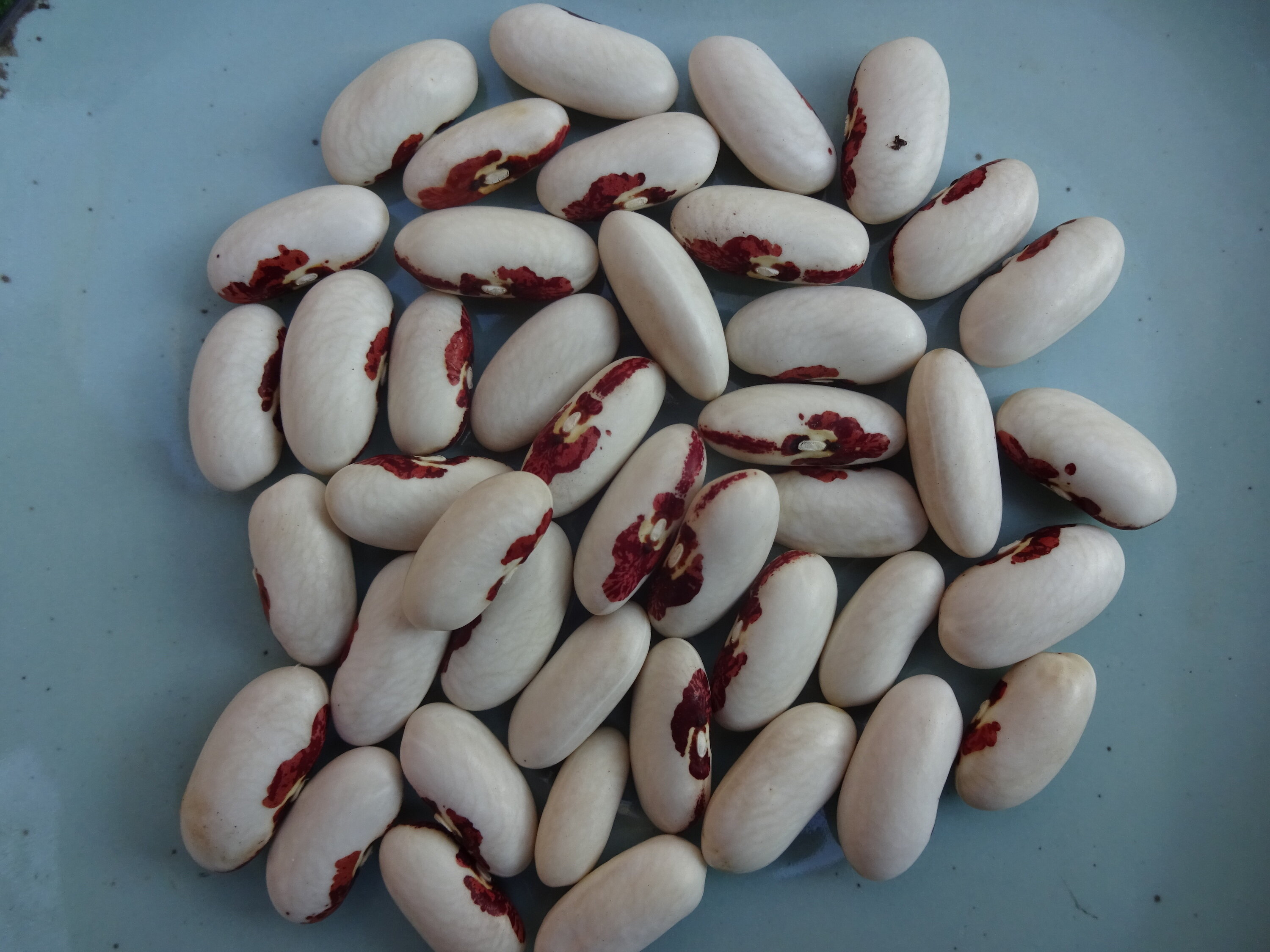 Klettert über 2m hoch, gerade, grüne Schoten, die Körner sind 2/3 weiß und 1/3 rot - braun gefärbt. Sehr ertragreich, bei mir eine der späteren Sorten.