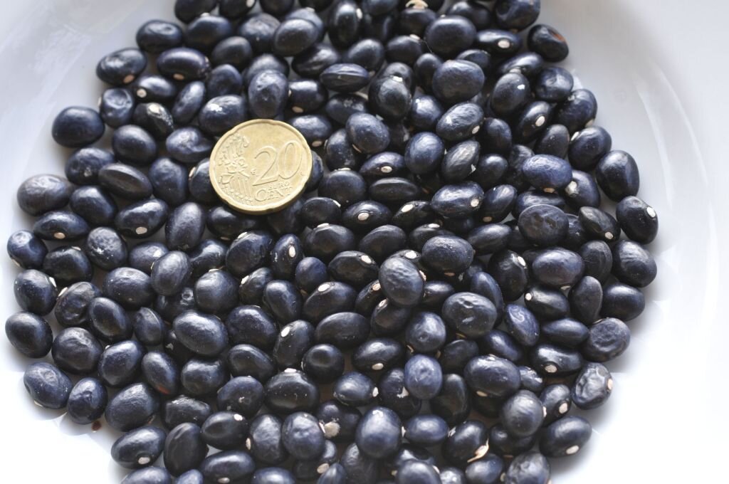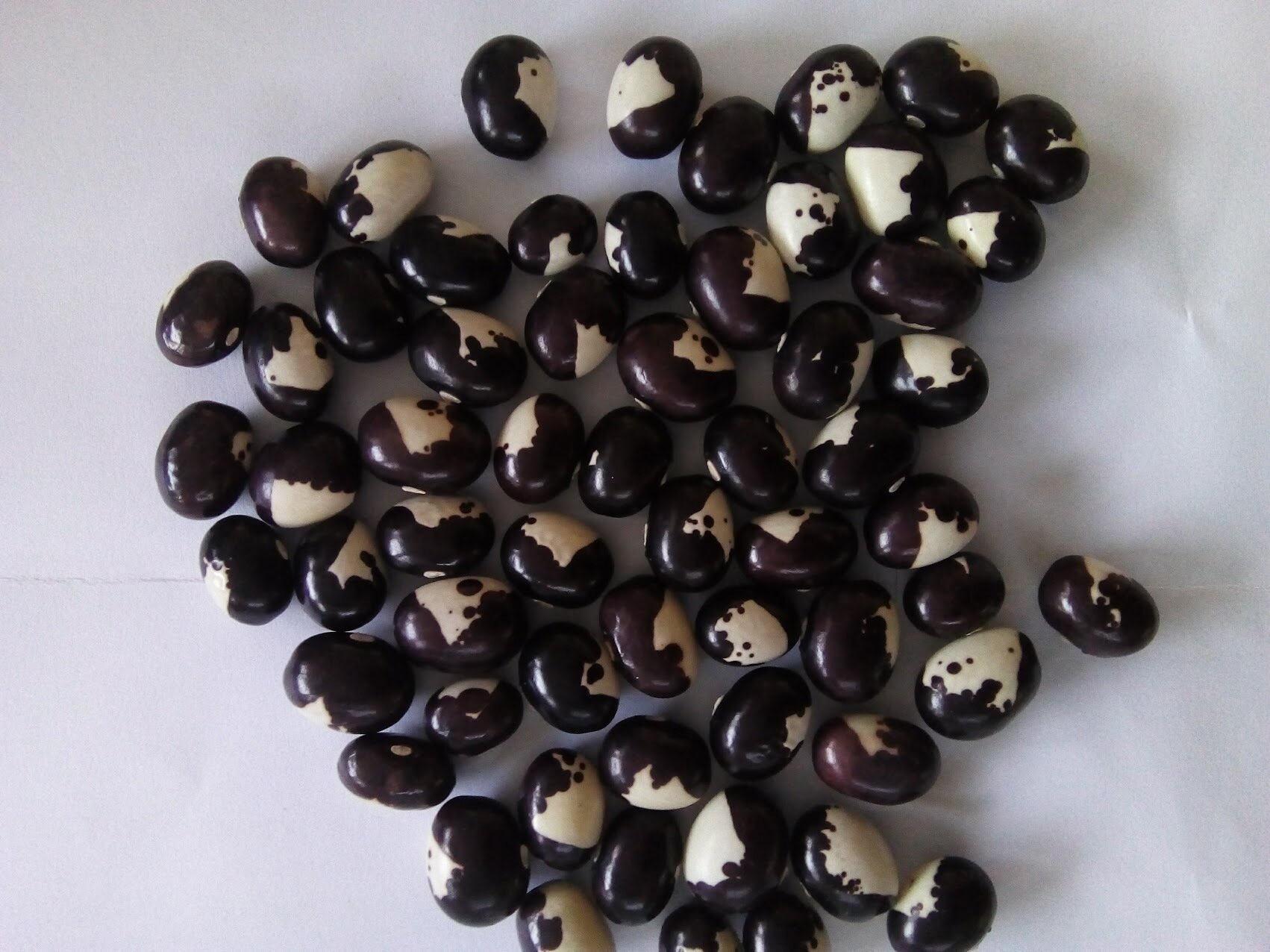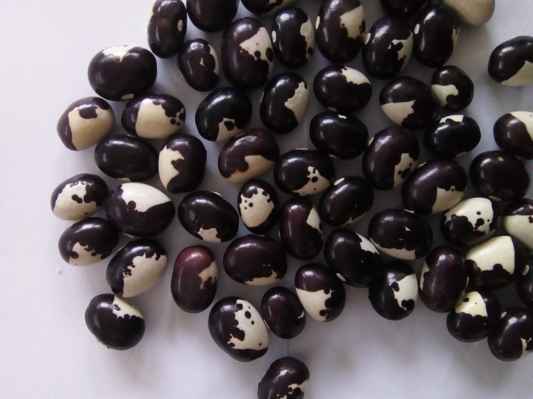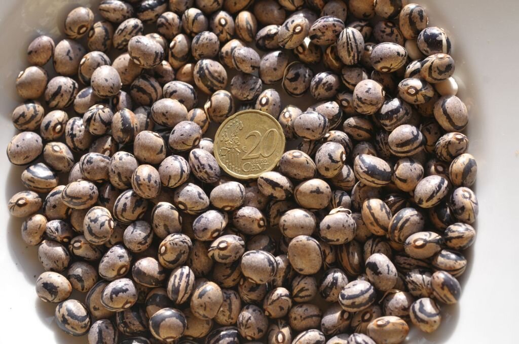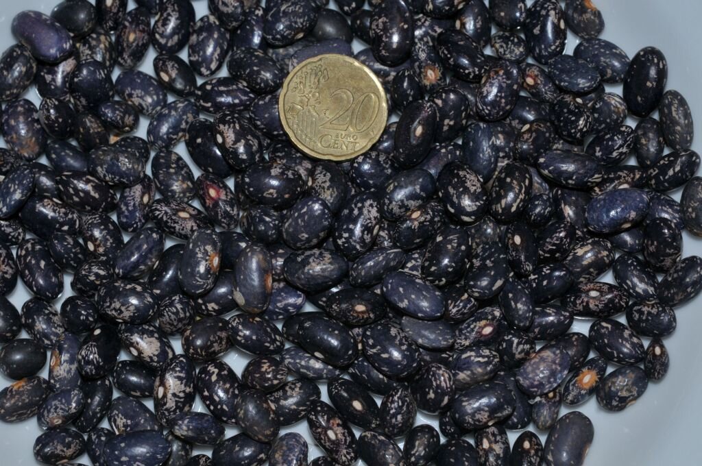 "Gute der Berge". Mittelfrüh reifende, sehr große Bohnenkörner, Hülse grün, fädig. Korn schwarz-weiß gemustert Seit 2004 von S. Sahling, Italien.