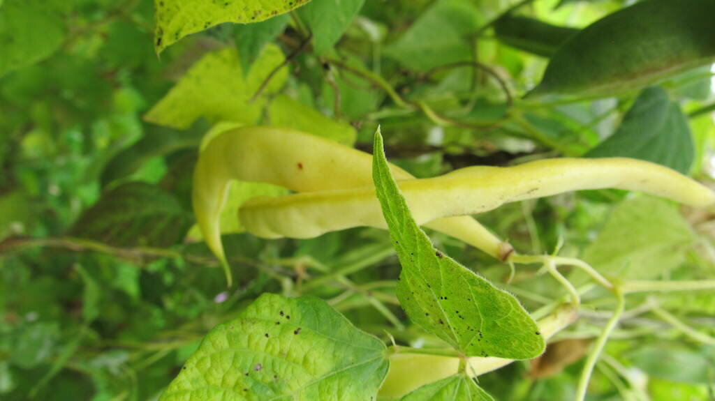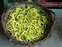 Gelbe, gebogene Fisolen, die besonders gut schmecken, wenn die Bohnen schon dick sind, fadenlos. Ertragreich, spätreifend. Korn weinrot-violett gesprenkelt. Steirische Spezialität, die schon seit Generationen in meiner Familie weitervermehrt wird.