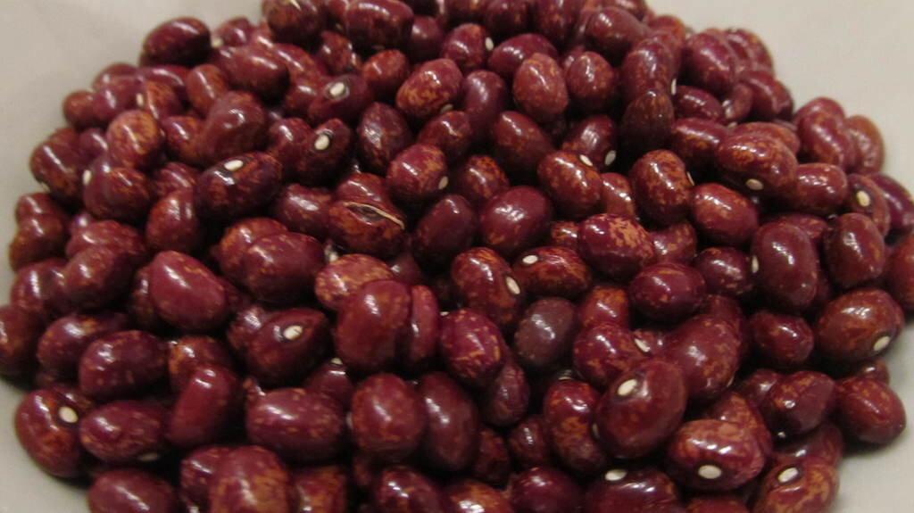 Speckbohne, robuste Sorte , grüne Fisole-früh ernten , weiter als Trockenbohne verwenden, Bohne braunes Korn mit dunklen Streifen ,früh reifend, gekochtes Korn hat einen sehr guten Geschmack,