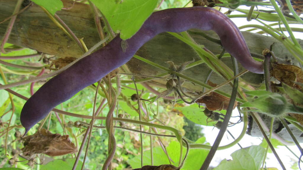 Stangenbohne, die als Fisole genutzt wird. Schöne dunkel-lila Schoten (bis zu 25cm lang und 1cm breit) mit weißen Bohnen. Werden beim Kochen grün. Jung als Fisole nutzbar, die anderen einfach hängen lassen und als Trockenbohnen verwenden. Leicht auslösbar, sehr ertragreich!