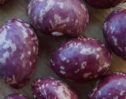 Bis 3m hohe Stangentrockenbohne, großes dunkelblaues Korn, beige Sprenkel, robust, recht früh reifend. 1990 vom Grazer Markt.