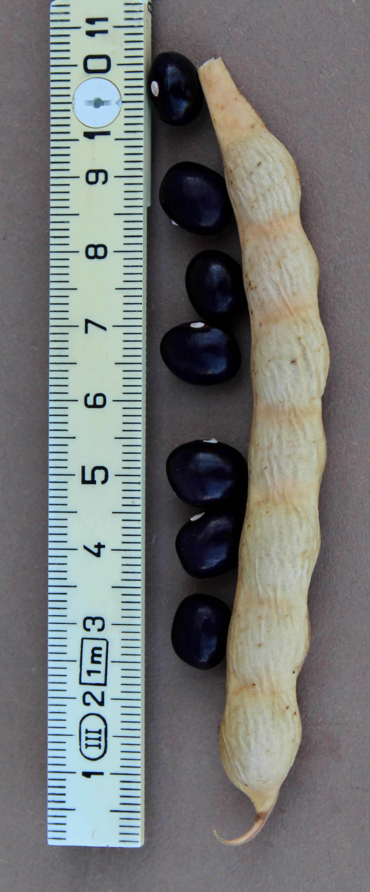 3m hoch. Hülse fädig, dick, gerade, grün, Korn schokoladebraun, rund wie eine Erbse. Wärme liebend, langsam reifend. Alte Regionalsorte aus einem weststeirischem Hausgarten. 1999 über Ing. Pelzmann, Wies.